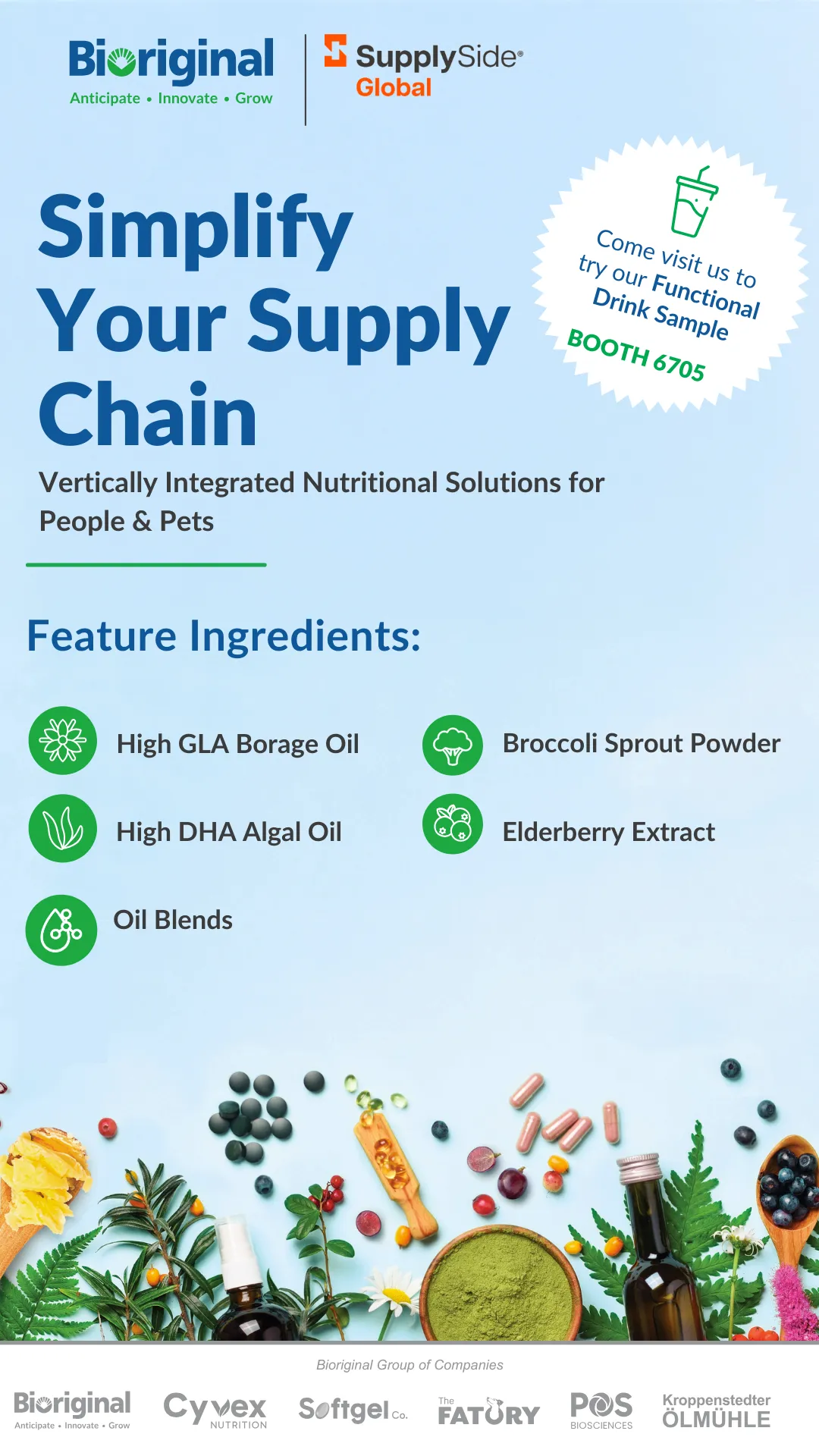 Through the Bioriginal Group of Companies—including Cyvex Nutrition, Softgel Co., POS Biosciences, Kroppenstedter Ölmühle, and The Fatory—we offer fully integrated solutions from sourcing and processing to formulation, packaging, and distribution.